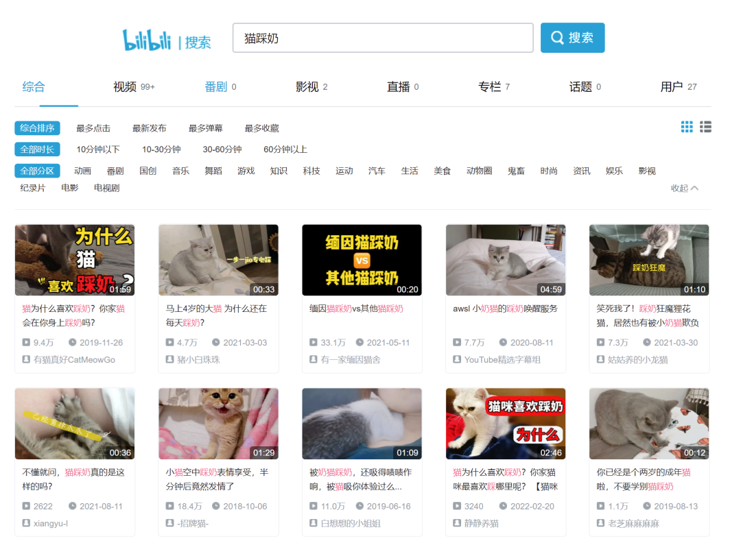二是根据文案搜索,比如文案里提到猫踩奶,可以在B站搜:猫踩奶,这样就可以找到相对应的视频素材。