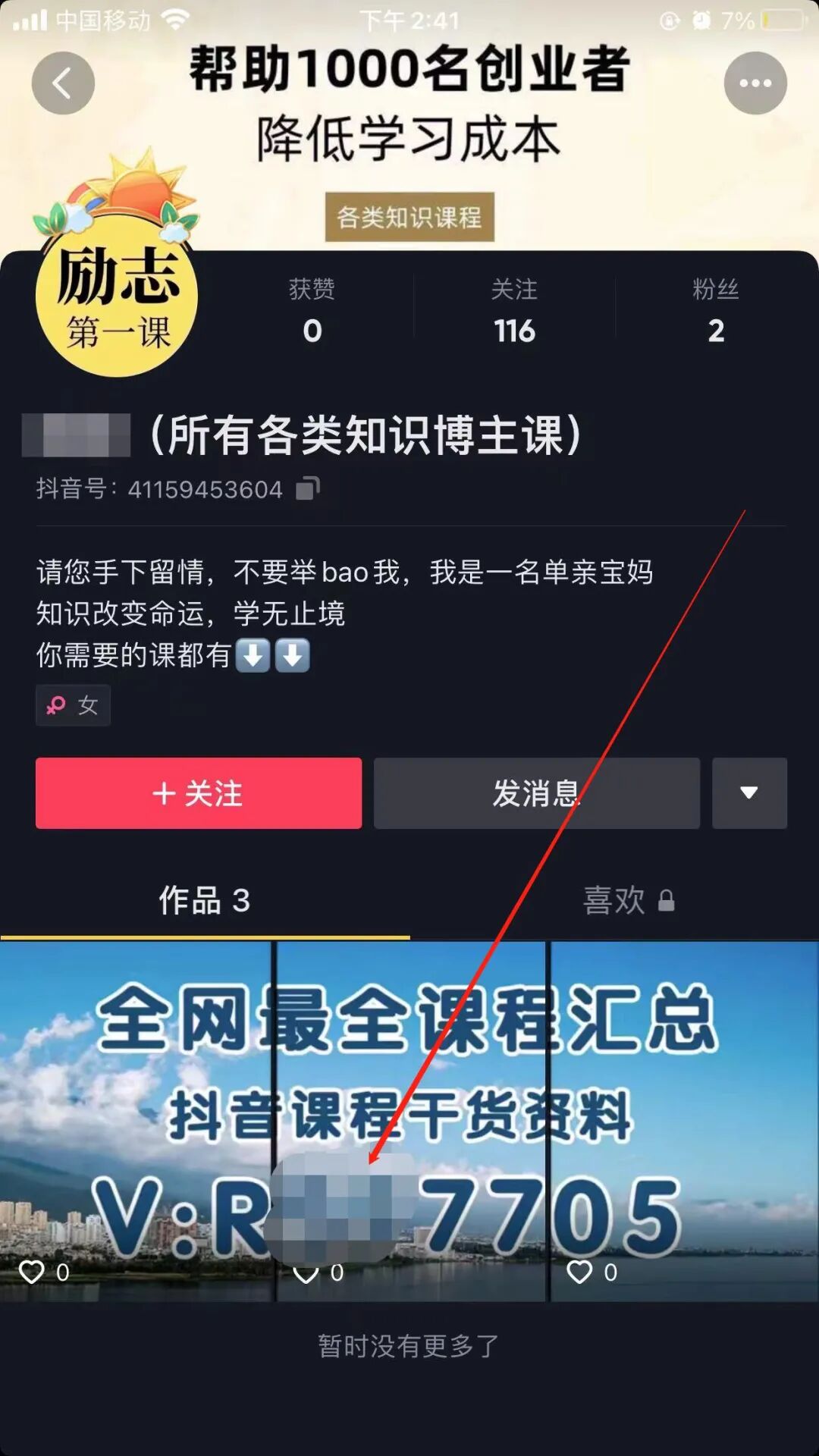 我说:这样的评论,别人一看名字和表情包,就知道你有资源,然后就点进主页,看到了视频封面的微信。