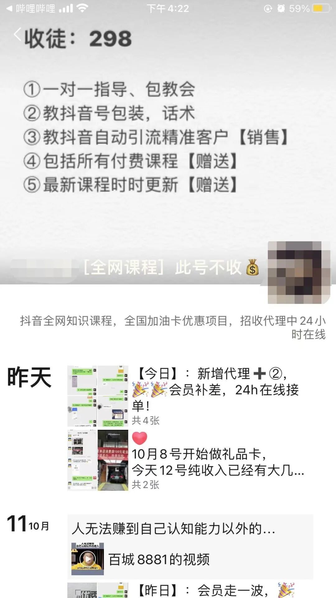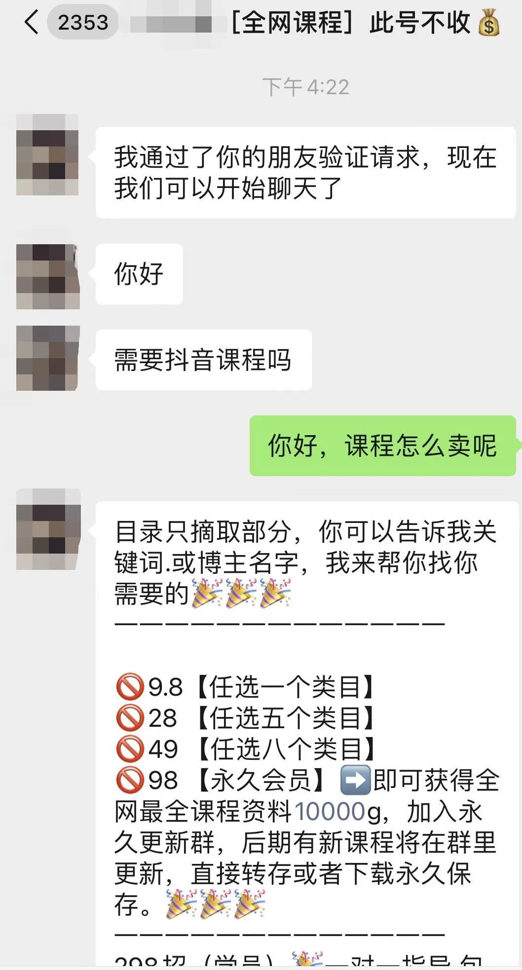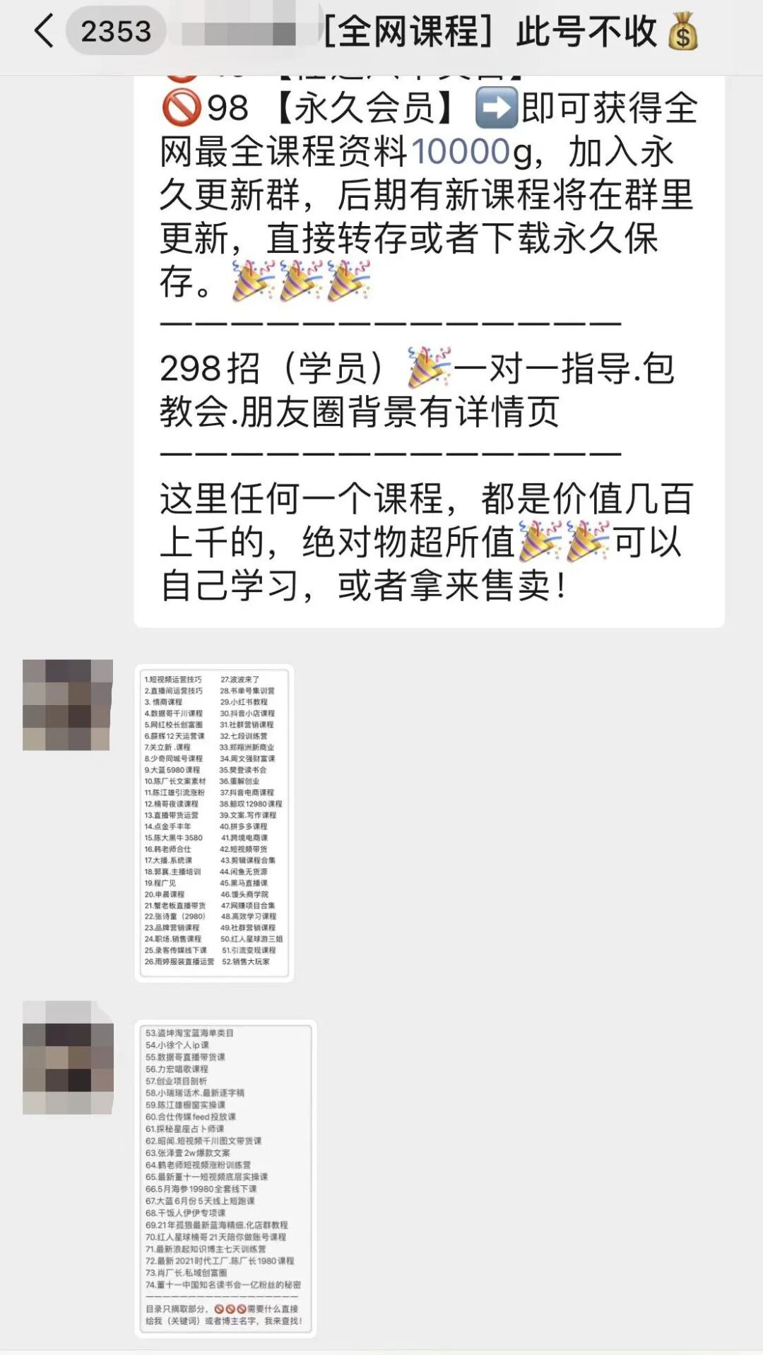 我说:我刚加了一个,他说1个类目9.9,5个类目的课程28元,98全包,298可以成为代理并带徒。