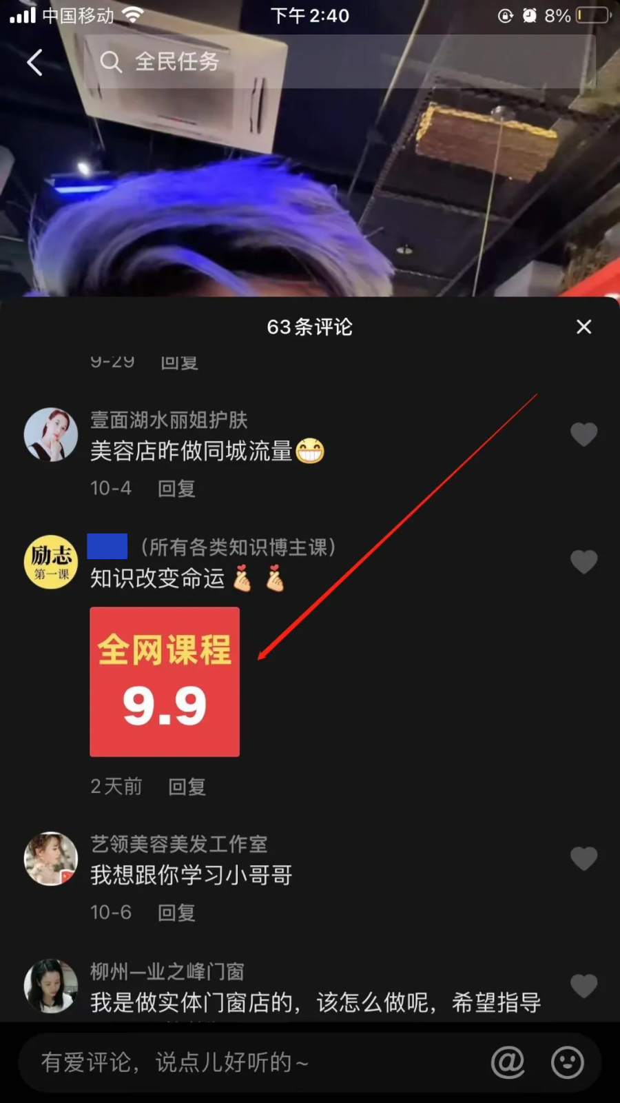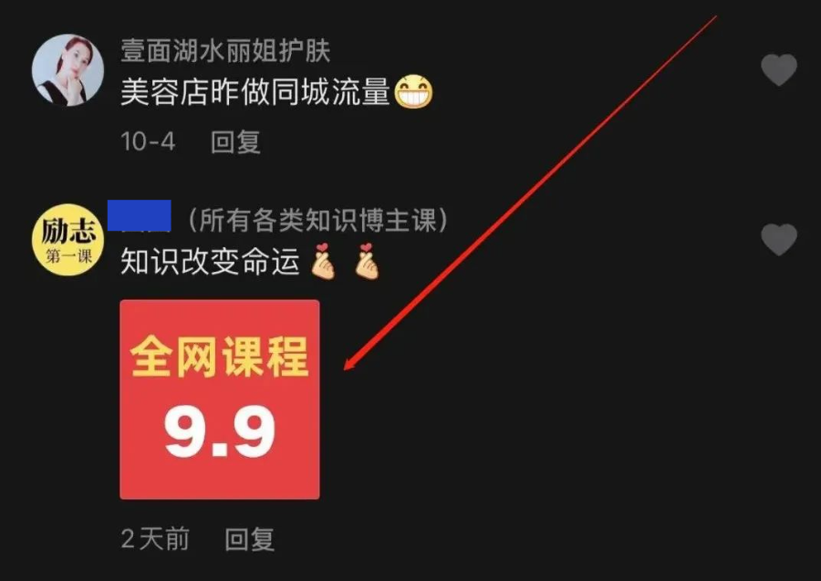 王五:文字+表情包。文字就随便说,说些不痛不痒的话,比如:知识改变命运/一起学习和成长哦/热爱学习人生才会进步,表情包就是一张图,纯色背景上写“全网课程9.9”。图片要么你去评论区翻翻同行,找到一个就收藏到表情包里,要么你就美图秀秀做一个。