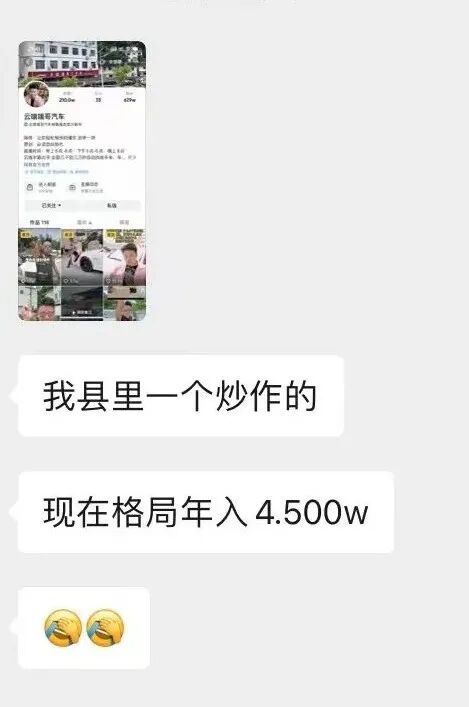 万金阁有个群友在群里说,他们本地有个卖二手车的二愣子,每天就拿手机拍视频,讲二手车七七八八的事,67万粉丝,一年变现四五百万。