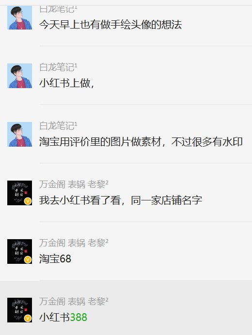 刚好,在社群看到老黎也说了这事,他找了小红书上做手绘头像的,报价388,这中间的利润就在300多了。