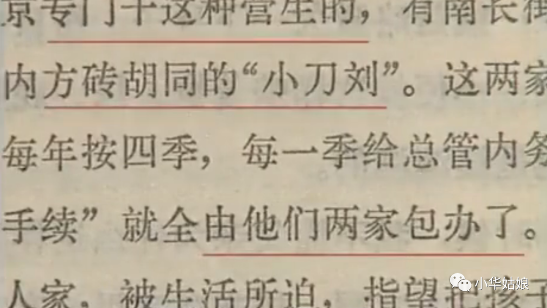 《晚清宫廷生活见闻》是一本回忆录,是解放后由北京市政协文史委员会组织清宫中的遗老遗少写的。在这本书中,有清宫老太监回忆说,光绪二十几年前,在北京有专门干这种净身营生的,著名的如北长街会计司的毕五,和地安门外方砖胡同的小刀刘,这两家的家族都是清朝的七品官。鼎盛时期,一个季度要给宫中总管内务府近40名太监。