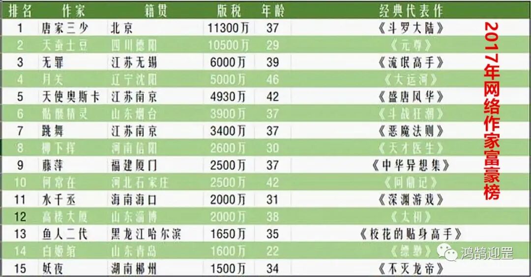 以2017年“中国作家富豪榜”为例,排名前三的唐家三少、天蚕土豆、无罪,分别以1.13亿、1.05亿,0.6亿的版权收入雄踞三甲。这样高的稿费,纯文学作家连想都不敢想。