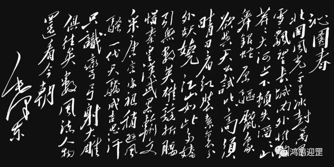 江山如此多娇,引无数英雄竞折腰。惜秦皇汉武,略输文采;唐宗宋祖,稍逊风骚。一代天骄,成吉思汗,只识弯弓射大雕。俱往矣,数风流人物,还看今朝。