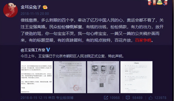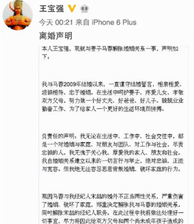 2016年8月,王宝强在社交平台发布离婚声明称“与马蓉结束婚姻关系”。