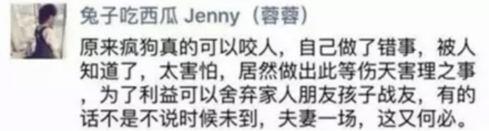 “原来疯狗真的可以咬人,自己做错了事,被人知道了,太害怕,居然做出此等伤天害理之事,为了利益可以舍弃家人朋友孩子战友,有的话不是不说时候未到。夫妻一场,这又何必。”