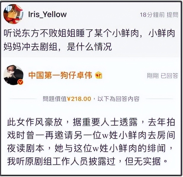知名狗仔卓伟回答的相当暧昧“此女作风豪放”“拍戏时曾邀请W姓小鲜肉去房间夜读剧本”“剧组人员披露过,但无实据”。