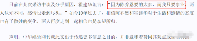 后来霍建华对这段恋情以“她要的太多,而我只要事业,两人认知不同,感情也走到了尽头”做了总结。