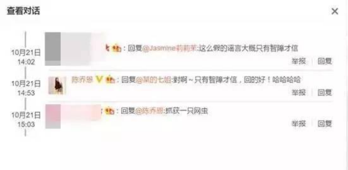 陈乔恩没有正面回应这件事,而是在网友留言中以“智障才信”做了回复。