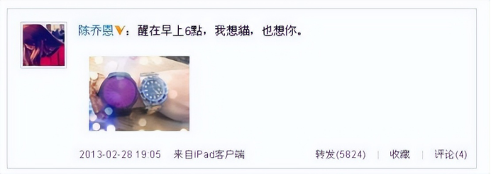 2013年,陈乔恩发了一个动态配图说“醒来早上6点,我想猫,也想你”。