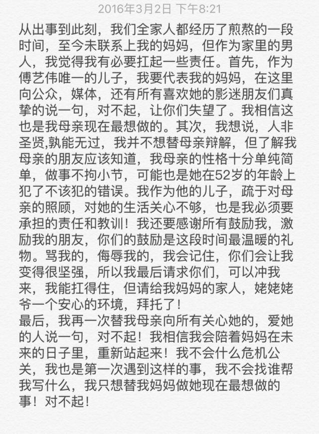随后傅艺伟的儿子高乐男在社交平台上替母亲进行了道歉,说母亲单纯简单,犯了不该犯的错。