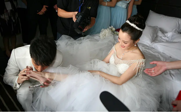 接亲时,贾乃亮抬起李小璐的脚,虔诚的亲吻了她的脚背。