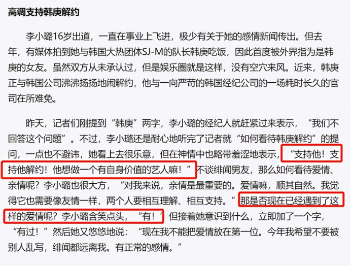 在一次采访时,李小璐更是公开力挺韩庚解约。