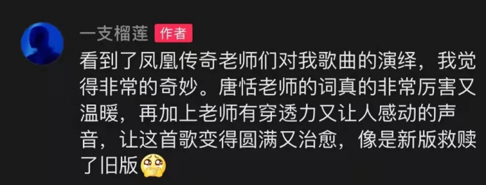 后来《海底》的原唱“一支榴莲子”也公开发文力挺凤凰传奇“圆满又治愈,新版救赎了旧版”。