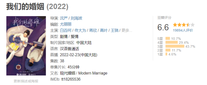 今年的《我们的婚姻》,高开低走、热度平平,至今在豆瓣只有6.6分的评分。