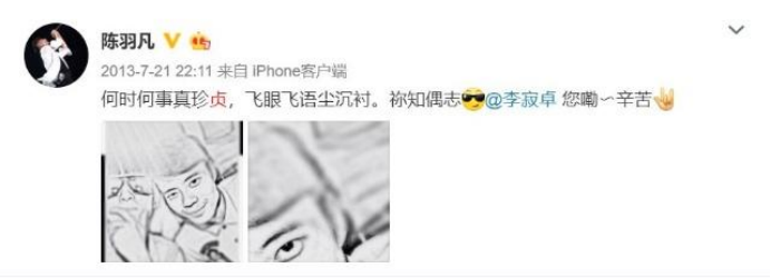 2014年七夕,陈羽凡转发了一条微博,配文“有缘相爱真贞珍”。
