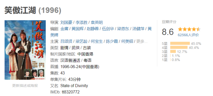即使26年过去,之后又出现了李亚鹏、霍建华等版本,可吕颂贤的这版《笑傲江湖》仍旧以8.6的评分稳居第一。