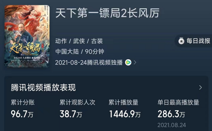 去年的《天下第一镖局2长风厉》,分账票房仅有96.7万。