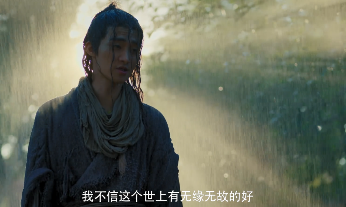 这时天上下起了雨,男主好似想起来自己断了条胳膊遭人背叛应该伤心,于是就冲入雨中说“我现在就是个废人,我不信这个世上有无缘无故的好”。