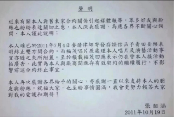 福茂公司为了不受张韶涵的家庭事件影响,匆匆解除了10年合约。