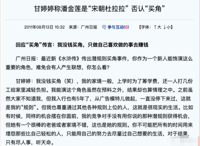2011年,新版《水浒传》上映之后收视极好,甘婷婷的潘金莲更是被网友称为“最美潘金莲”“最清纯潘金莲”。