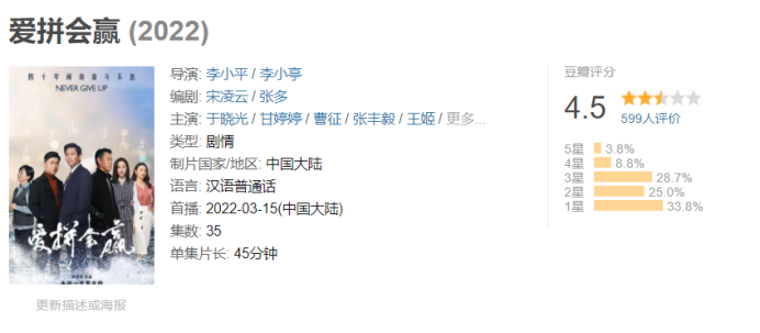 2022年,她与于晓光合作的《爱拼会赢》开分之后只有4.5,评论人数还不到千人。
