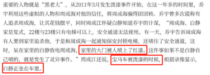 除此之外,有一次汽车被喷漆时,白静正坐在车里,这一切都被监控拍到了。
