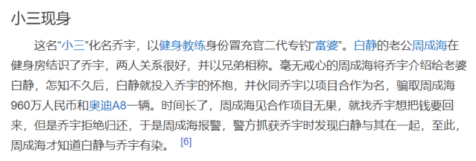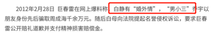随后巨春雷继续爆料称,白静有“婚外情”,“男小三”乔宇以朋友身份先后骗取周成海千余万元。