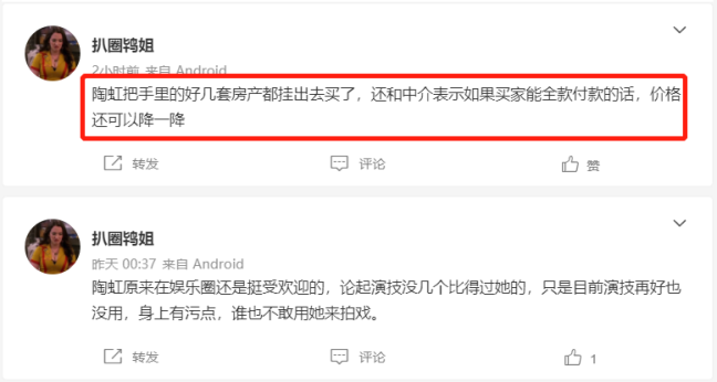 除此之外,有网友爆料称,陶虹将名下的房产全都挂牌销售,如果全额付款还可进一步降价。