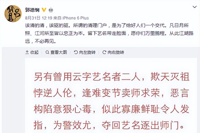 2016年,郭德纲重修德云社家谱,并以“该清的清,该驱的驱。所谓的清理门户,是为了给好人们一个交代”做了说明。
