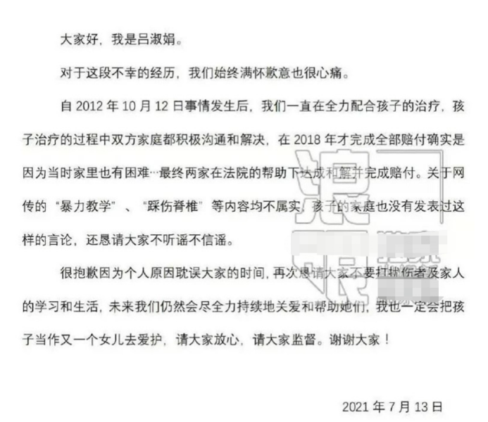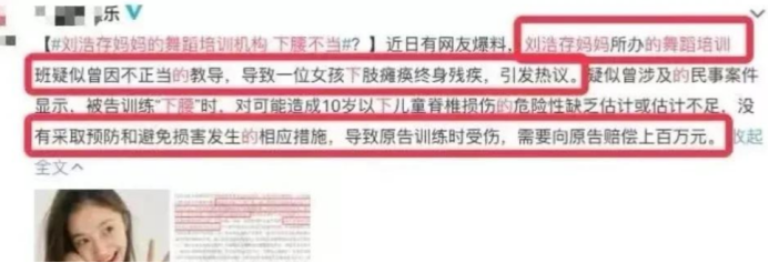 不过刘浩存身上最大的争议还是父母创办的舞蹈培训学校致6岁女孩下肢瘫痪的事情。