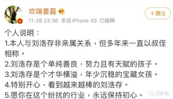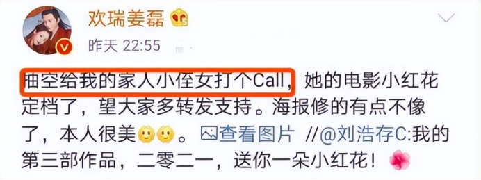 在这期间,曾推出《古剑奇谭》《麻雀》等多部爆款剧的欢瑞世纪高管姜磊,在给刘浩存的电影做宣传时亲切的称其为“小侄女”。