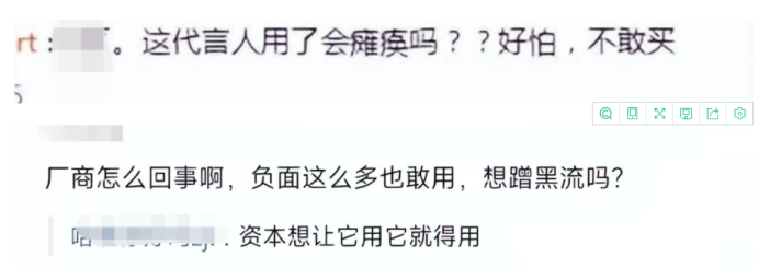 “负面这么多,想蹭黑流吗”“这代言人用了会瘫痪吗?好怕,不敢买”“这个牌子避雷了”