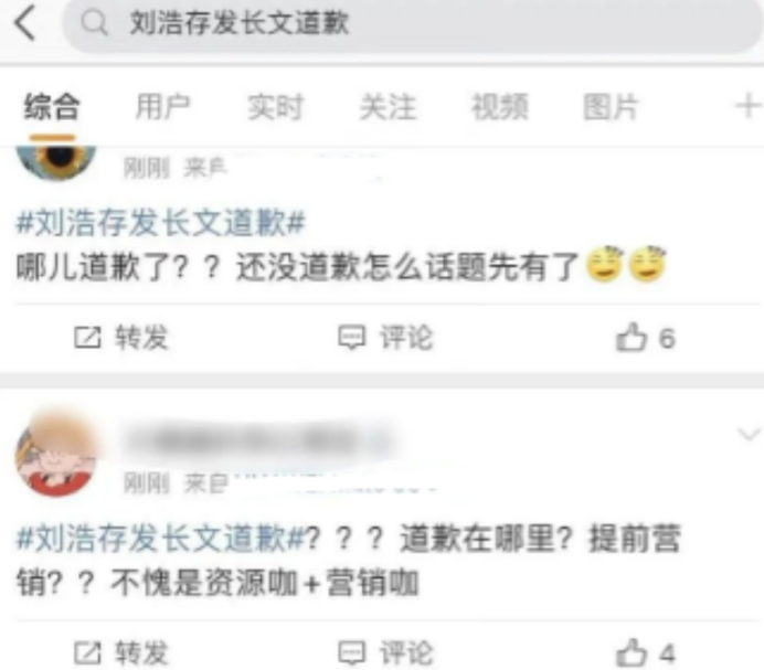 可是话题起来了,热搜也上了,全网却看不到任何刘浩存的道歉内容。