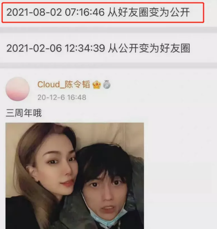 陈令韬的社交平台曾公开过与“大花妞”的合照,配文写着“三周年”。