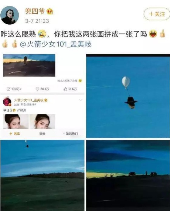 结果第二天晚上,有一位网友挂出孟美岐的这幅画,配文称:咋这么眼熟,你把我这两张画拼成一张了吗?