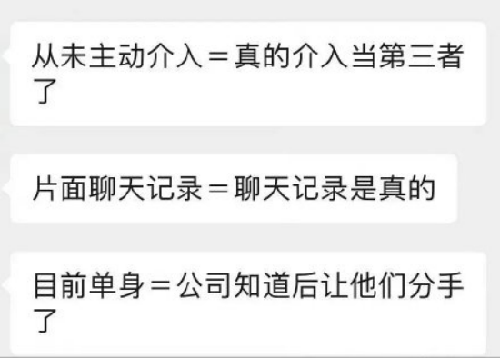 “从未主动介入=真的介入当了第三者”“片面聊天记录=聊天记录是真的”“目前单身=公司知道舆论发酵后让她们分手”