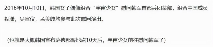 2016年10月,孟美岐所在的女团前往韩军驻地进行慰问演出。