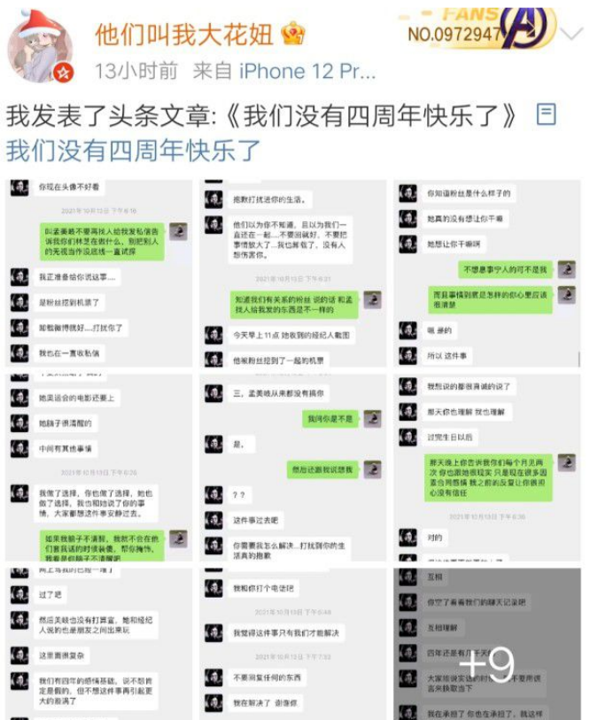 “大花妞”除了放出自己与陈令韬的聊天记录,还放出了陈令韬与孟美岐的聊天截图。
