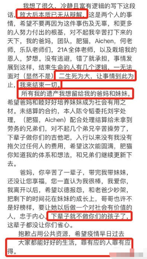 通篇都是“结束一切”“遗产”“生死为大”“下辈子”等自寻短见般的暗示。