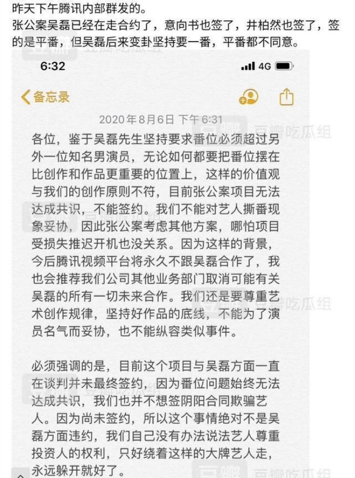 之后网上传出一张疑似腾讯内部的群发信息,大概意思就是在合作项目中吴磊坚持番位超过另外一名演员,平番都不同意。