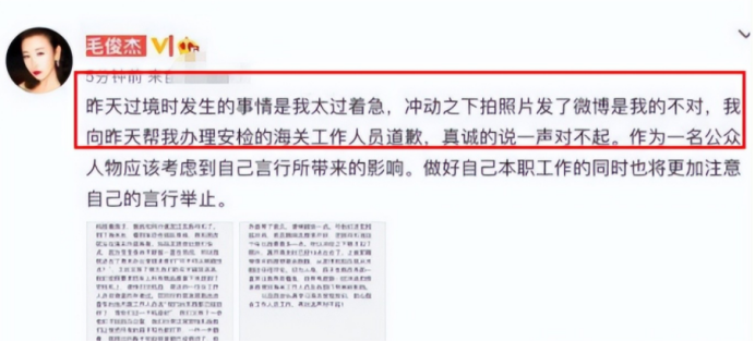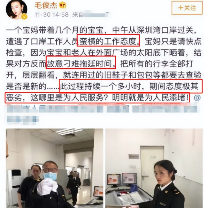 2019年,毛俊杰在社交平台上公开斥责海关工作人员态度蛮横、故意刁难拖延时间。