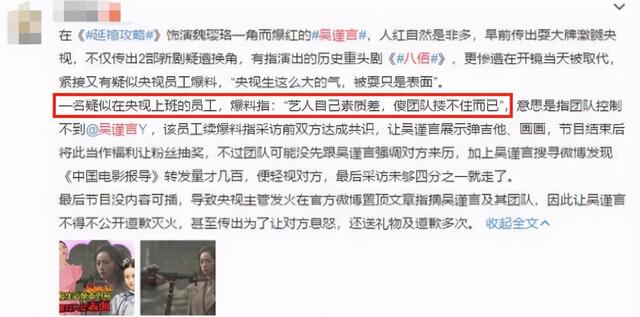 当时吴谨言提前到网上查看了栏目组的动态,发现只有几百个评论和转发,误以为对方是个不知名的小媒体。
