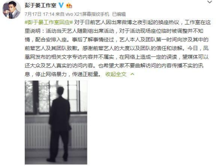 对此,彭于晏的工作室不得不再次发表声明“对临时调换座位并不知情,只是配合安排入座,不要曲解访问内容,传递正能量”。