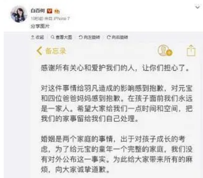随后,陈羽凡与白百何分别作了回应,表示双方早在15年就已经协议离婚,隐瞒至今的原因是不想影响到孩子成长。