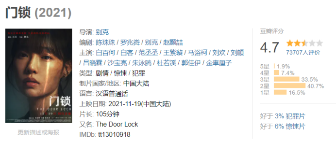 前几天上映了一部由她主演的犯罪悬疑电影《门锁》,最终票房2.42亿,在豆瓣口碑却只有4.7分。