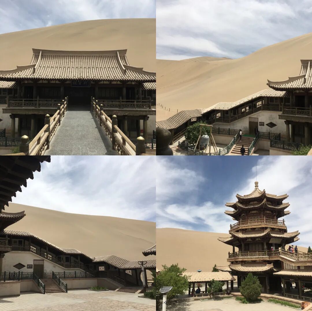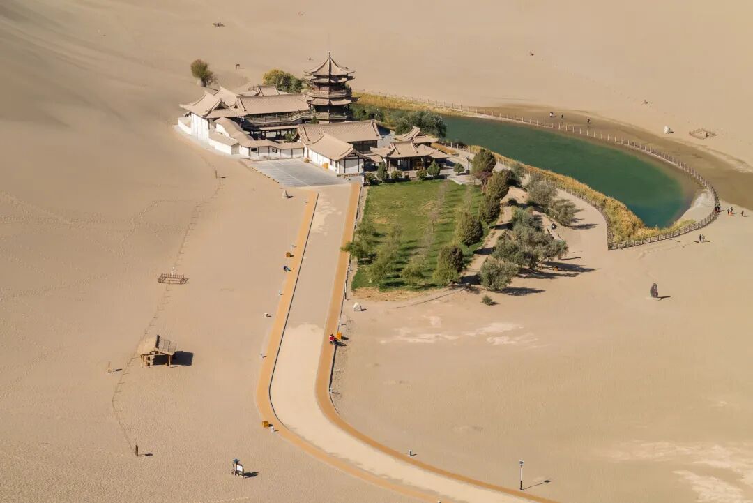 这儿最美的时刻便是黄昏日落时,金色的残阳光芒洒在黄沙上,将天地都渲染成了一片金色。蕴藏其中的月牙泉,便是这片沙漠中的精华,四周被黄沙包围的月牙泉,千百年来在风沙的侵蚀下,依然熠熠生辉。那一汪清澈的泉水,与周围的亭台楼阁一起,形成一种独特的大漠风情。