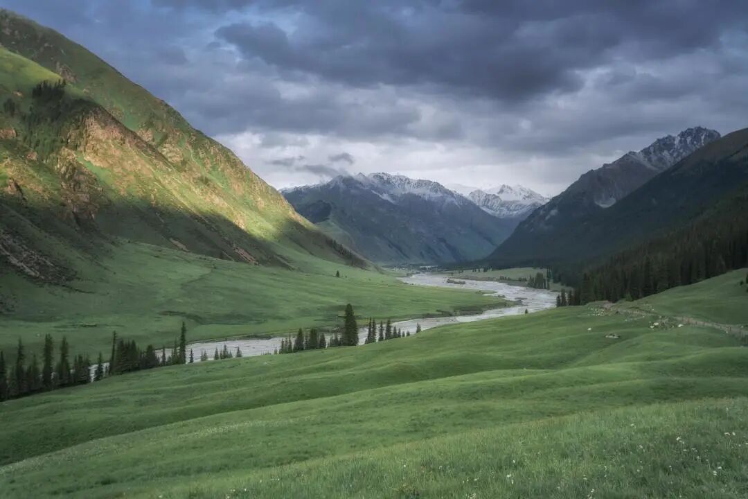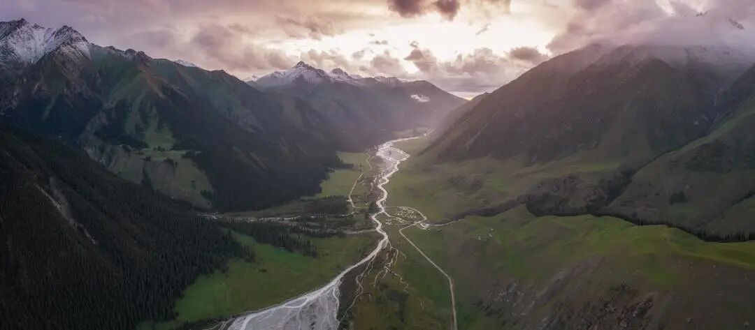 河流,雪山,云杉林立,这里风景壮丽,雪山耸立,夏塔河蜿蜒折绕与草原峡谷之中最终汇入特克斯河,它们与四季共同演绎编织着这古老而又原始的画卷。