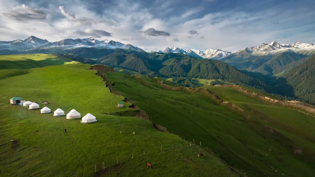 位于巩乃斯河谷的那拉提草原平均海拔在2000米以上,宝石蓝的天空与雄壮的山顶相接,被人们誉为“空中草原”,分布着山泉、溪流、河道,在成群的牛羊和洁白的蒙古包映衬下,草原风光无限,令人陶醉。